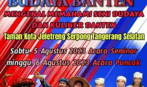 Perkumpulan Urang Banten (PUB) Pemerintah Kota Tangerang Selatan akan menggelar perhelatan Budaya Banten yang dikemas dalam sebuah event bertajuk Gebyar Seni Budaya Banten 2023 pada tanggal 5 hingga 6 Agustus 2023 mendatang.