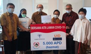 Dalam acara serah terima di RS St. Carolus Jl. Salemba Raya, Ketua Yayasan UID Tuti Hadiputranto, didampingi oleh Presiden Direktur PT Gajah Tunggal, Sugeng Rahardjo, menyerahkan secara simbolis 5000 hazmat tersebut yang diterima Direktur Utama RS St.Carolus, dr. JB. Endrotomo Sumargono, SpOT (K)