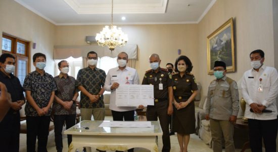 TANGERANG– Bupati Tangerang Ahmed Zaki Iskandar menyerahkan lahan seluas 6.965 M2 kepada Kepala Kejaksaan Tinggi (Kajati) Banten Reda Mathovani untuk pembangunan sekolah